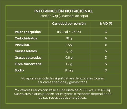 Avena tradicional arrollada en hojuelas, conserva su fibra y todos sus nutrientes.