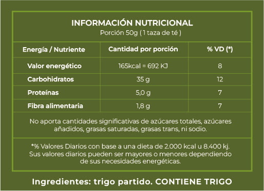 Fuente de energía. Buen aporte de proteínas, vitaminas y minerales como fósforo, calcio, hierro y magnesio. Al no estar refinado, y ser el grano entero, contiene un buen aporte de fibra brindando sensación de saciedad por más tiempo, regulando los niveles de glucosa y grasas en sangre.